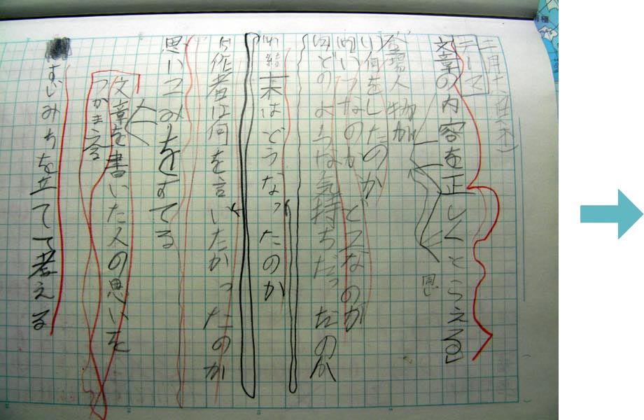 次に教師の解説後にノートに写すことで「自分専用の参考書」を作成する。直前の内容の復習をしながら頭の中で授業の流れをリピートし、知識の定着を促す。