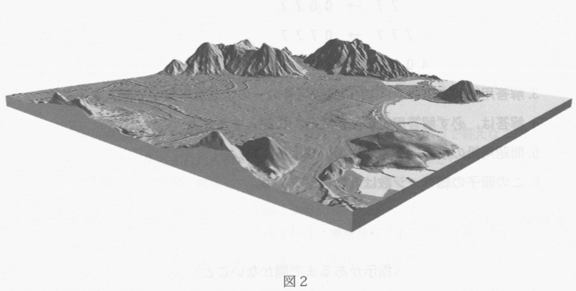 問4 図2は図1の1から4のいずれかの視点から見たときの地形の起伏を示したものです。図2の視点としてもっとも近いものを選び、番号で答えなさい。また、選んだ視点の矢印の先が向いている方位を八方位のいずれかで答えなさい。方位は漢字で書くこと。
